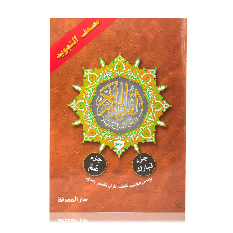Considering that these Parts contain small surahs; this item is a perfect start for kids, beginners and students. This product comes in the standard portrait form, combining the two parts (29 and 30) with a nice glossy soft cover. Each page contains 15 lines as any standard Quran, with an interpretation of selected words placed on the margins on every page. This item of the Tajweed Quran is in Hafs narration.