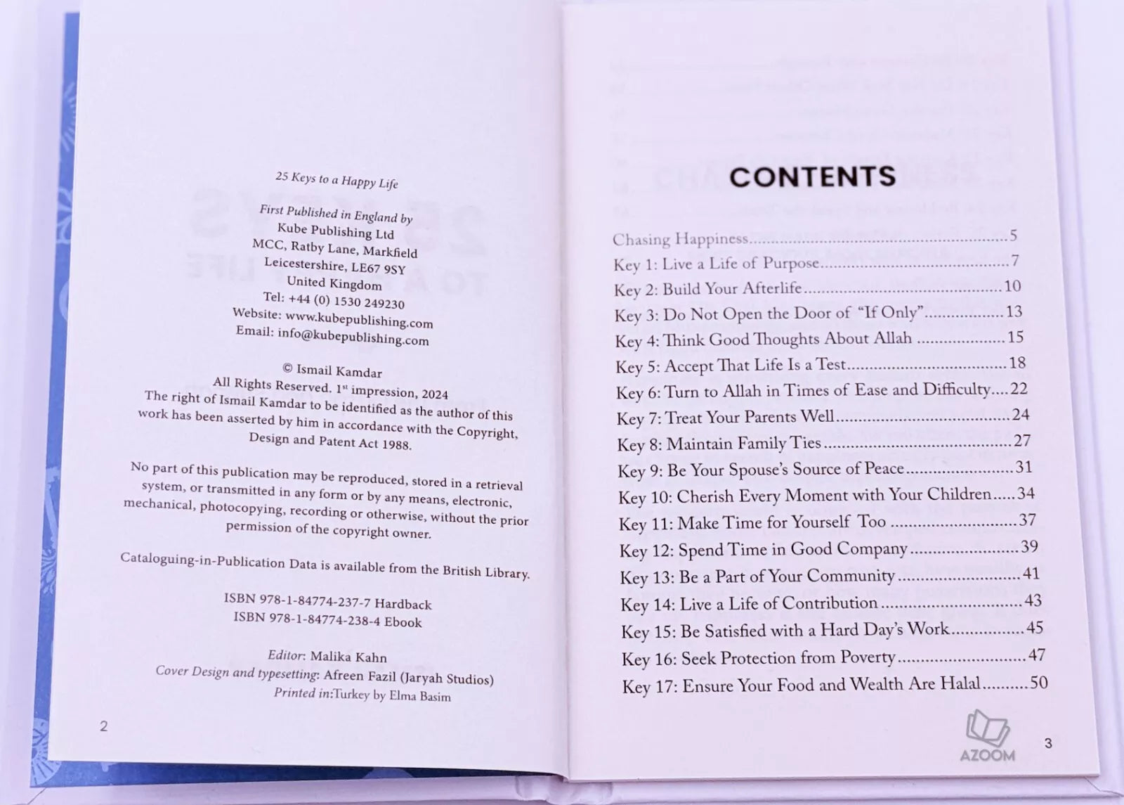In this book, Shaykh Ismail Kamdar explains 25 keys that unlock genuine happiness, inner peace, and contentment. These principles are taken from the Qur'an and Sunnah and are timeless in their application and effectiveness.