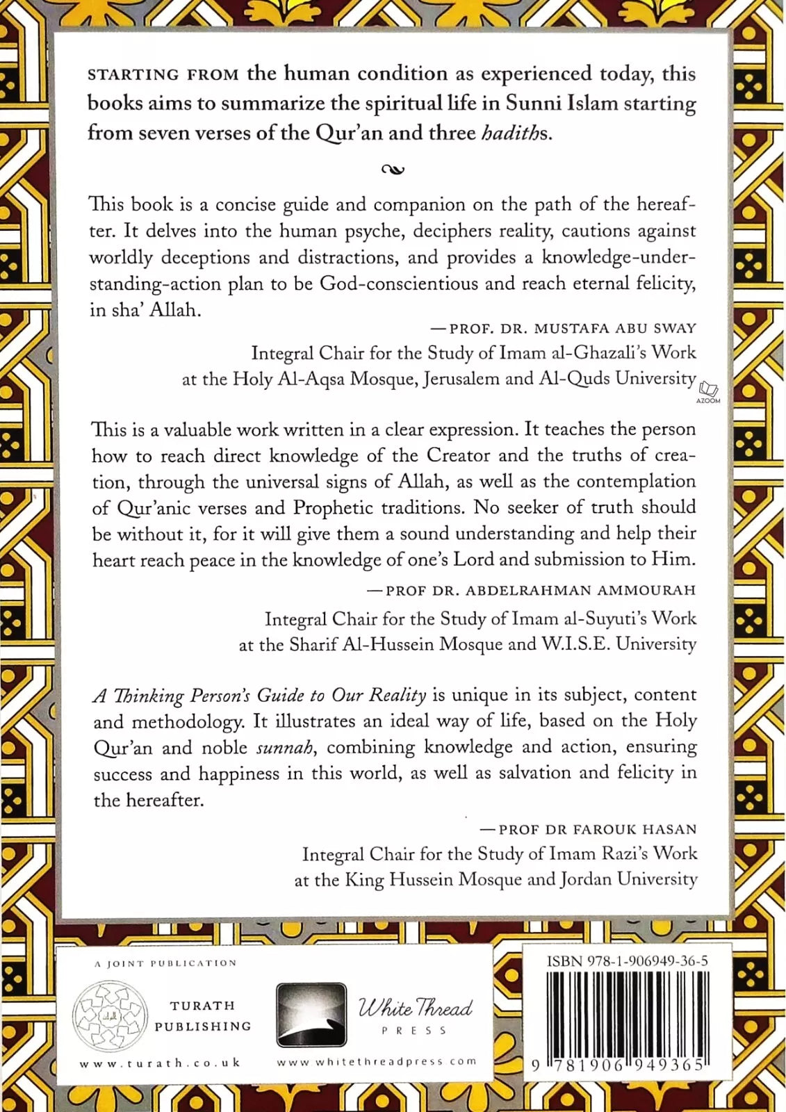 "This book is a concise guide and companion on the path of the hereafter. It delves into the human psyche, deciphers reality, cautions against worldly deceptions and distractions, and provides a knowledge-understanding-action plan to be God-conscientious and reach eternal felicity, inshaAllah." - Prof. Dr. Mustafa Abu Sway