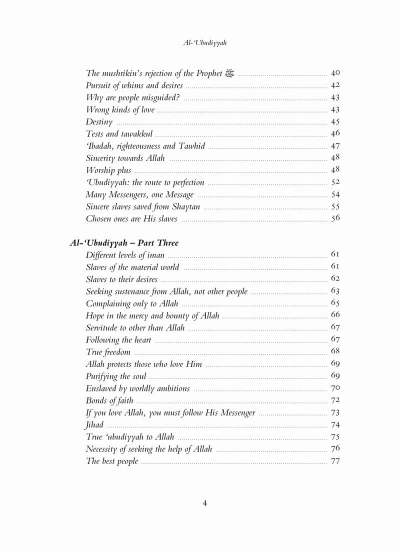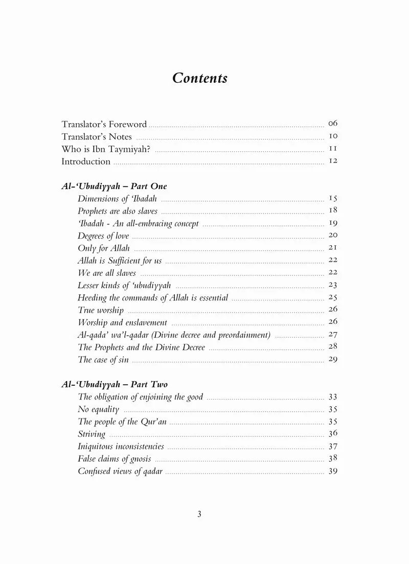 In this book, Shaykh ul-Islam Ahmad Ibn Taymiyah discusses the Islamic answers to the basic human questions in depth. He explains in detail the purpose of our existence, which is to be true slaves of Allah, making Him the focus of our love and attaining happiness and fulfilment by making Him our goal.