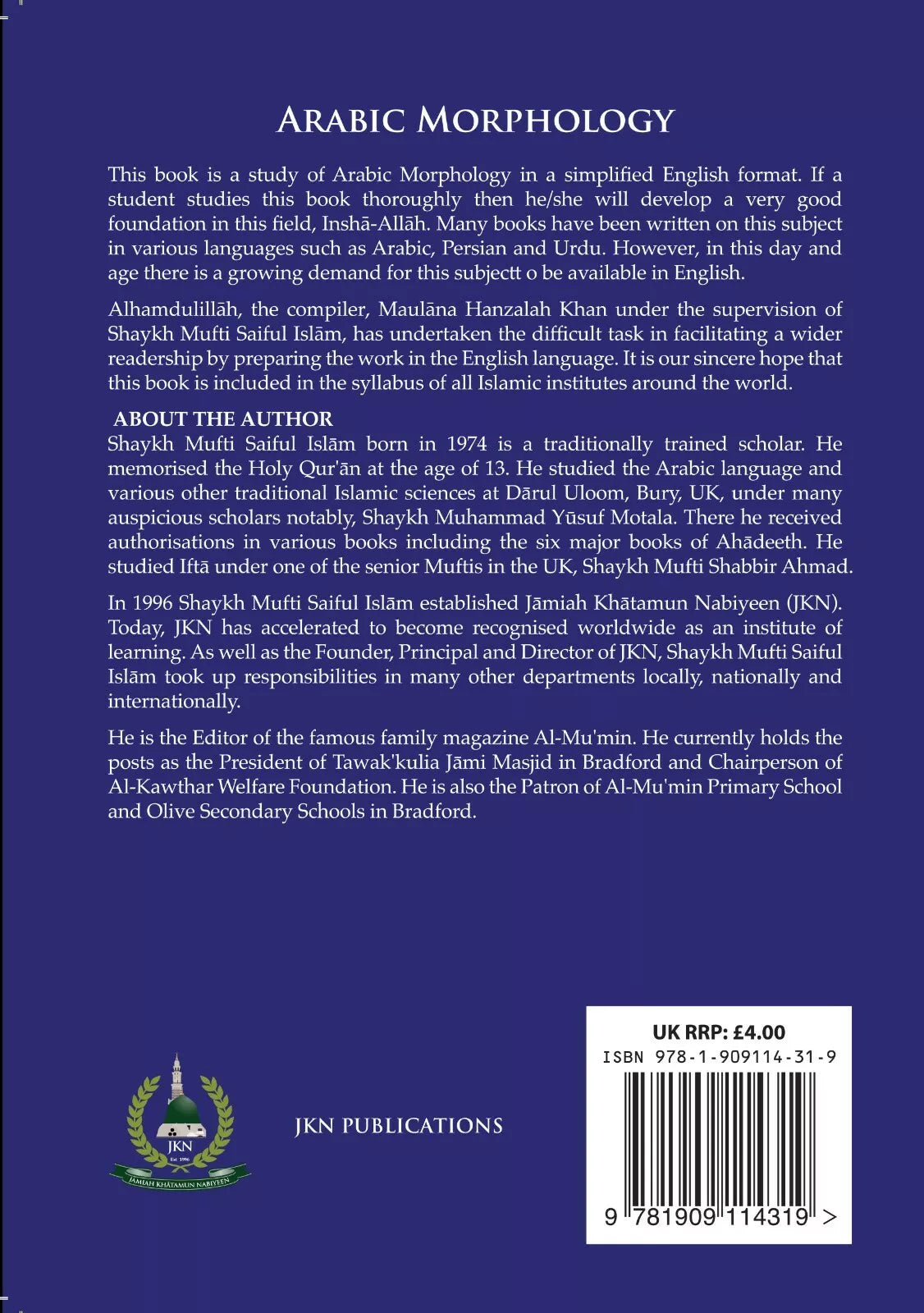 This book is a study of Arabic Morphology in a simplified English format. If a student studies this book thoroughly then he/she will develop a very good foundation in this field, Insha-Allah. Many books have been written on this subject in various languages such as Arabic, Persian and Urdu. However, in this day and age there is a growing demand for this subject to be available in English.