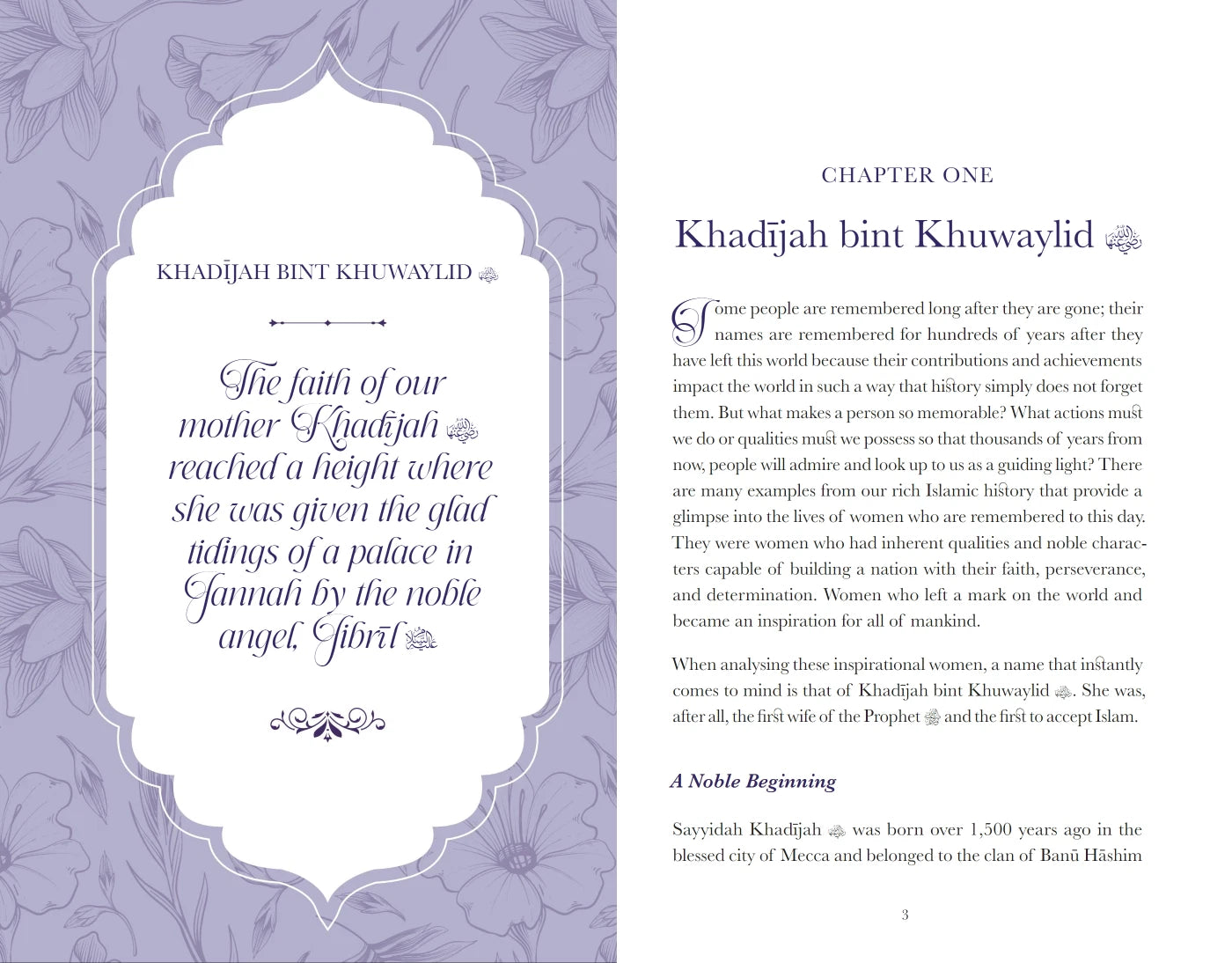 This book allows the reader to take a glimpse into the lives of thirty-seven amazing women. Starting with the women from the Prophet Muhammad's (SAW) household to female companions and pioneers of Islamic History. Women in Islamic History have had a huge impact on building nations. Many that have been through education, raising children, raising scholars or being scholars themselves.