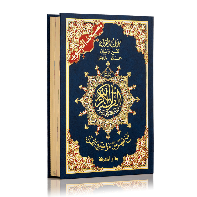 The blessed Qur’an with color-coding in reference to the rules of tajwid. In ‘Uthmani script. Includes explanations and clarification of difficult words (in Arabic). Also, includes an index (in Arabic). 15 Lines.