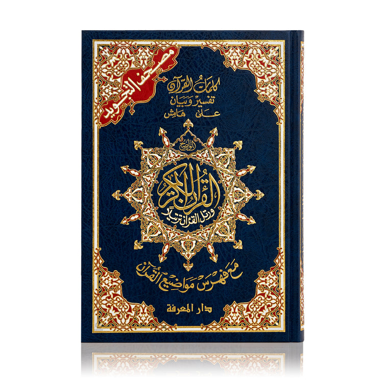 The blessed Qur’an with color-coding in reference to the rules of tajwid. In ‘Uthmani script. Includes explanations and clarification of difficult words (in Arabic). Also, includes an index (in Arabic). 15 Lines.