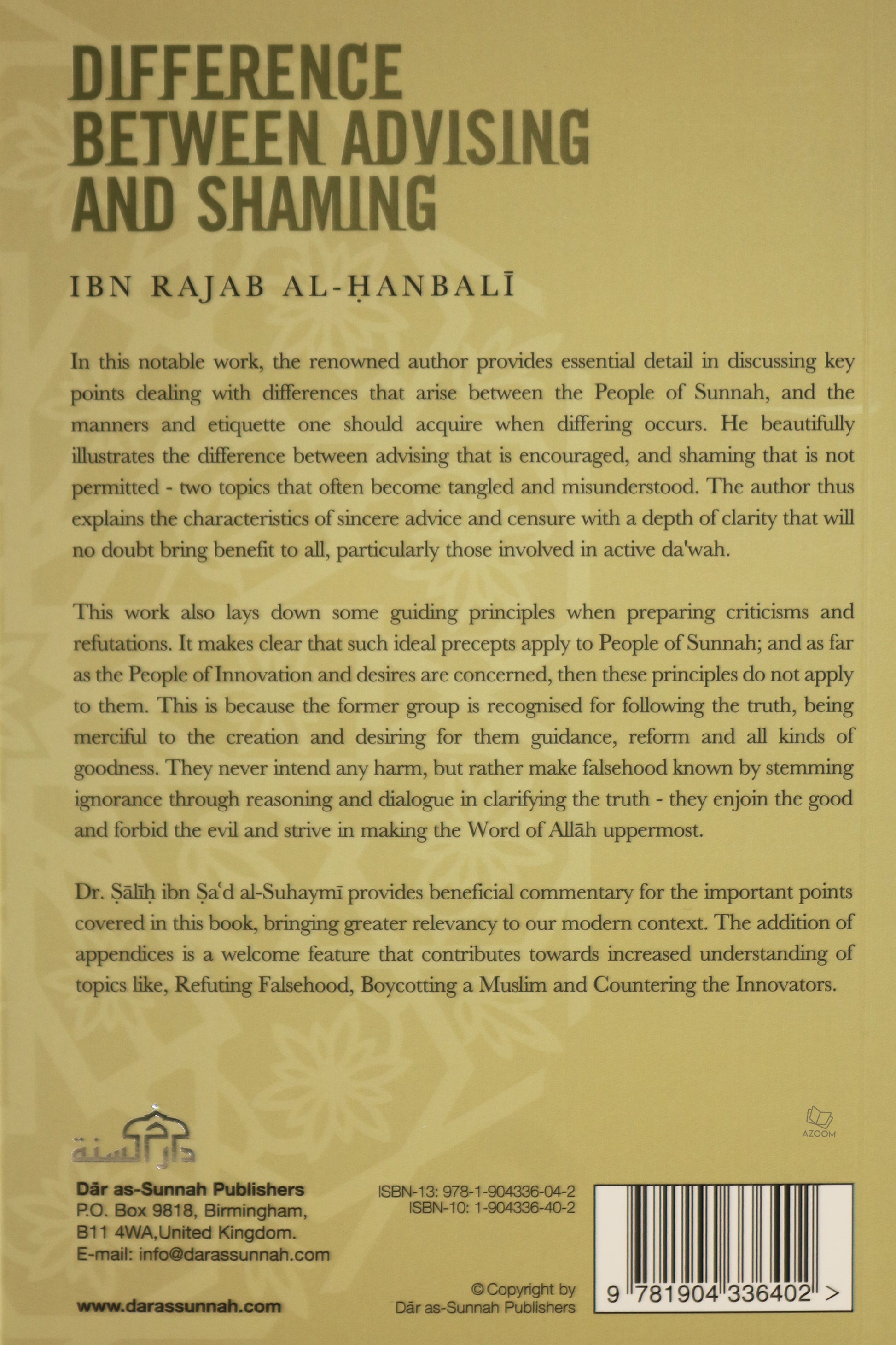 In this notable work, the renowned author provides essential detail in discussing key points dealing with differences that arise between the People of Sunnah, and the manners and etiquette one should acquire when differing occurs. He beautifully illustrates the difference between advising that is encouraged, and shaming that is not permitted - two topics that often become tangled and misunderstood.