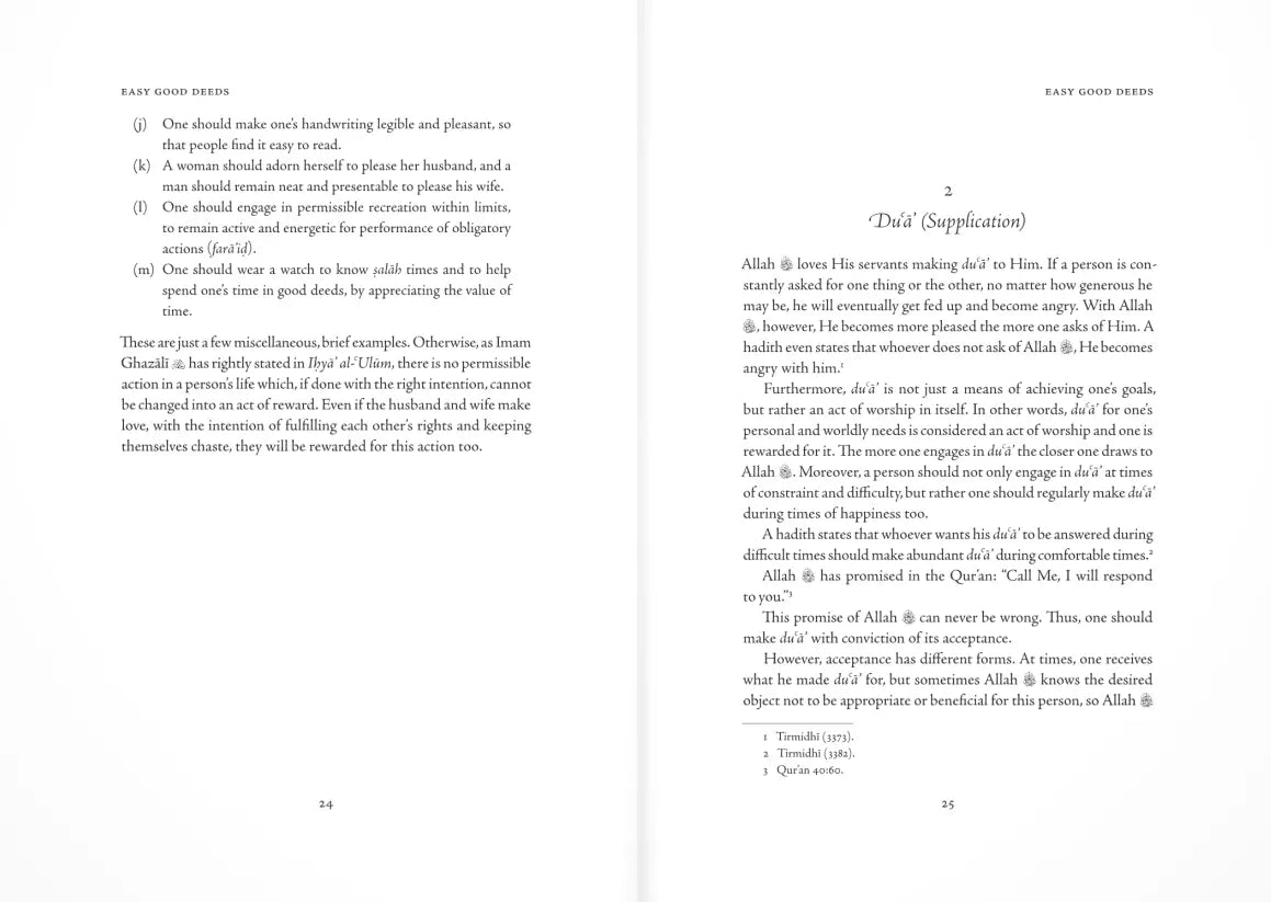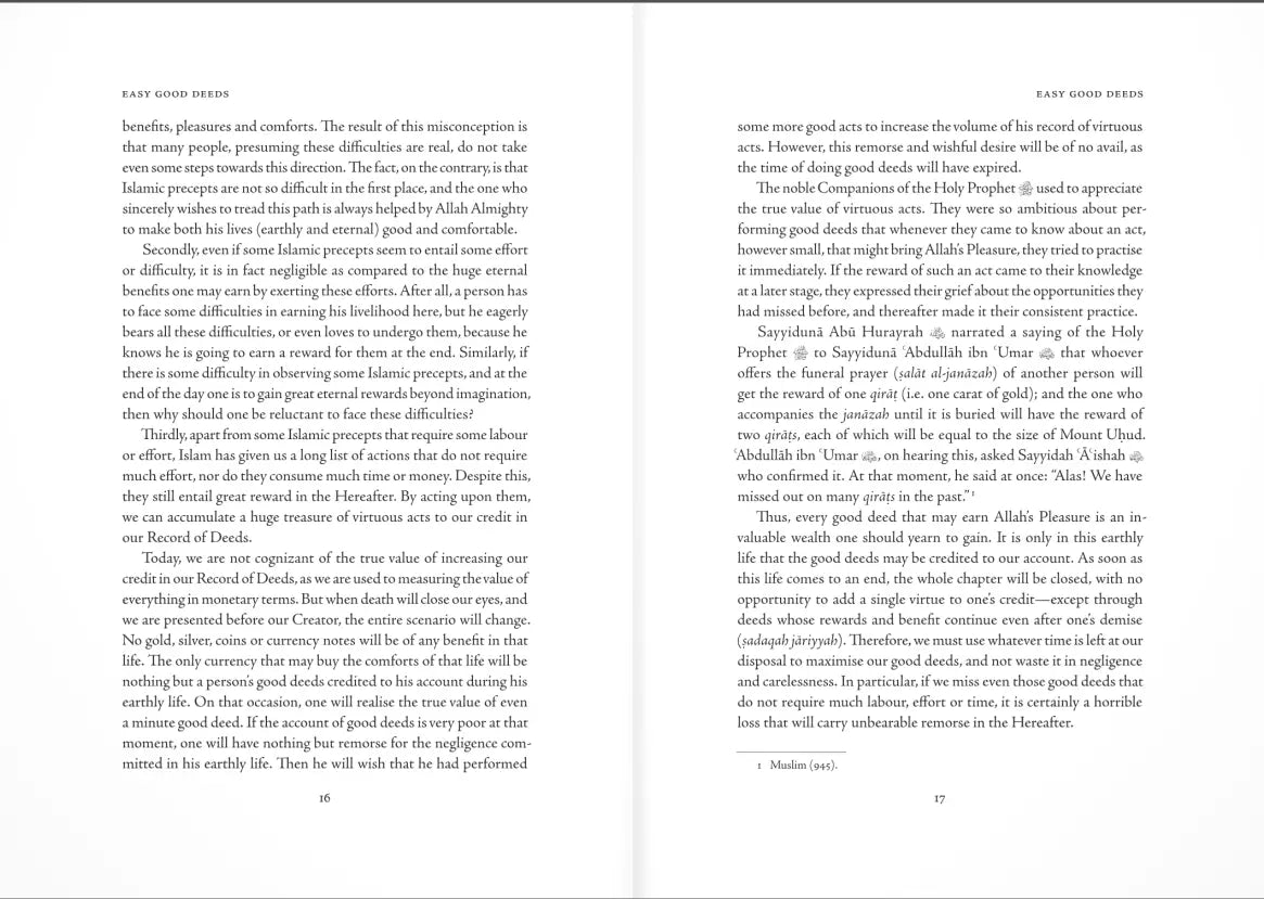 Easy Good Deeds is a valuable book which details many good deeds that a person can easily practise without any major effort. The author has highlighted actions over a wide spectrum of areas, ranging from worship to social conduct, all of which entail minimum effort but reap abundant reward nonetheless.