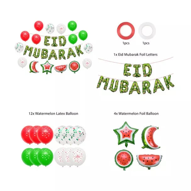 Green Watermelon Eid Mubarak Foil Letter: Bold and vibrant, these foil balloons spell out "Eid Mubarak" in stunning green with a playful watermelon-inspired touch. They create the perfect backdrop for your celebration, setting the tone for joyous gatherings with family and friends.
