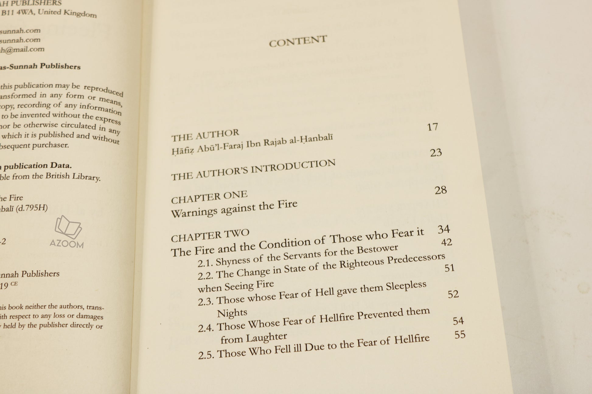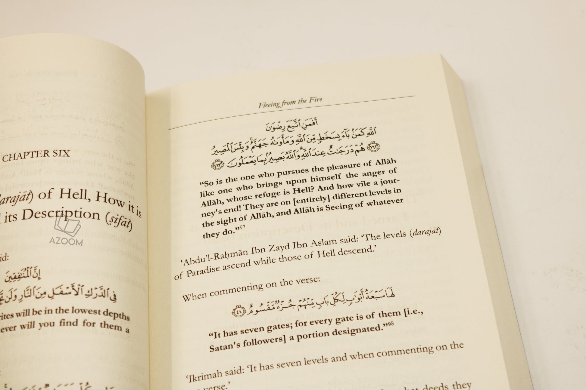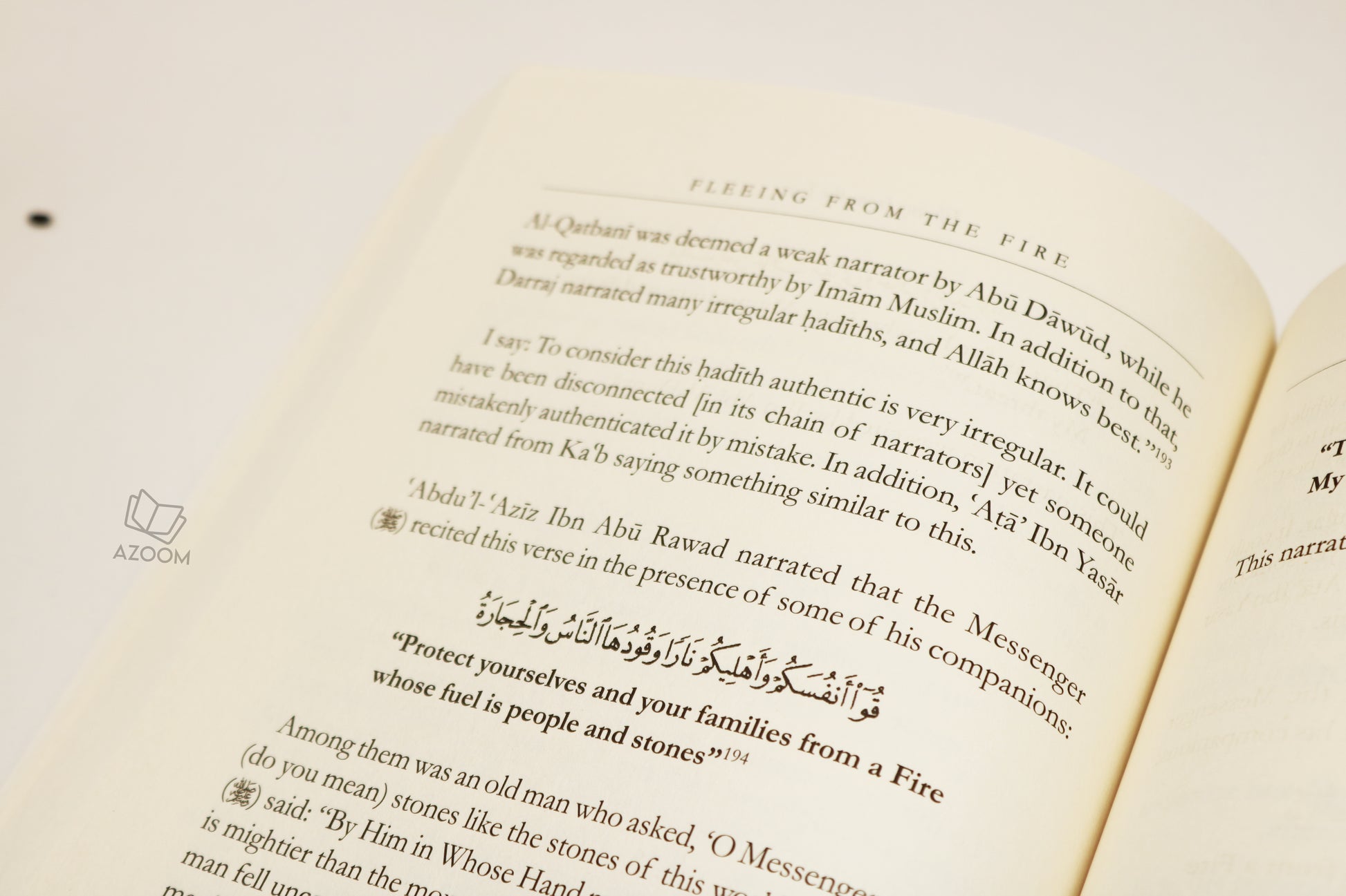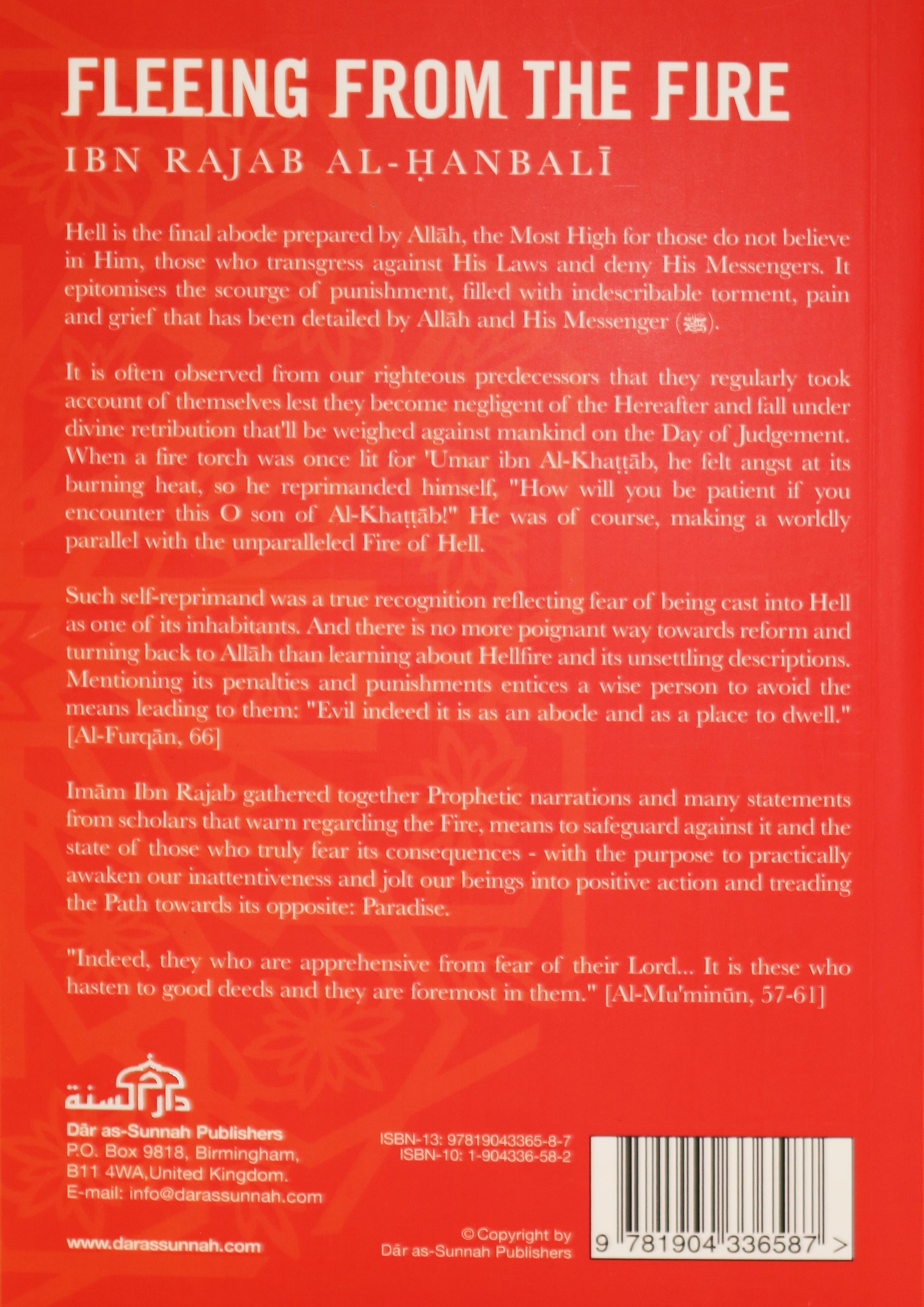 Mentioning its penalties and punishments entices a wise person to avoid the means leading to them: "Evil indeed it is as an abode and as a place to dwell." [Al-Furqan, 66] Imam Ibn Rajab gathered together Prophetic narrations and many statements from scholars that warn regarding the Fire, means to safeguard against it and the state of those who truly fear its consequences - with the purpose to practically awaken our inattentiveness and jolt our beings into positive action and treading the Path towards its opposite: Paradise. "Indeed, they who are apprehensive from fear of their Lord... It is these who hasten to good deeds and they are foremost in them." Al-Mu'minun, 57-61