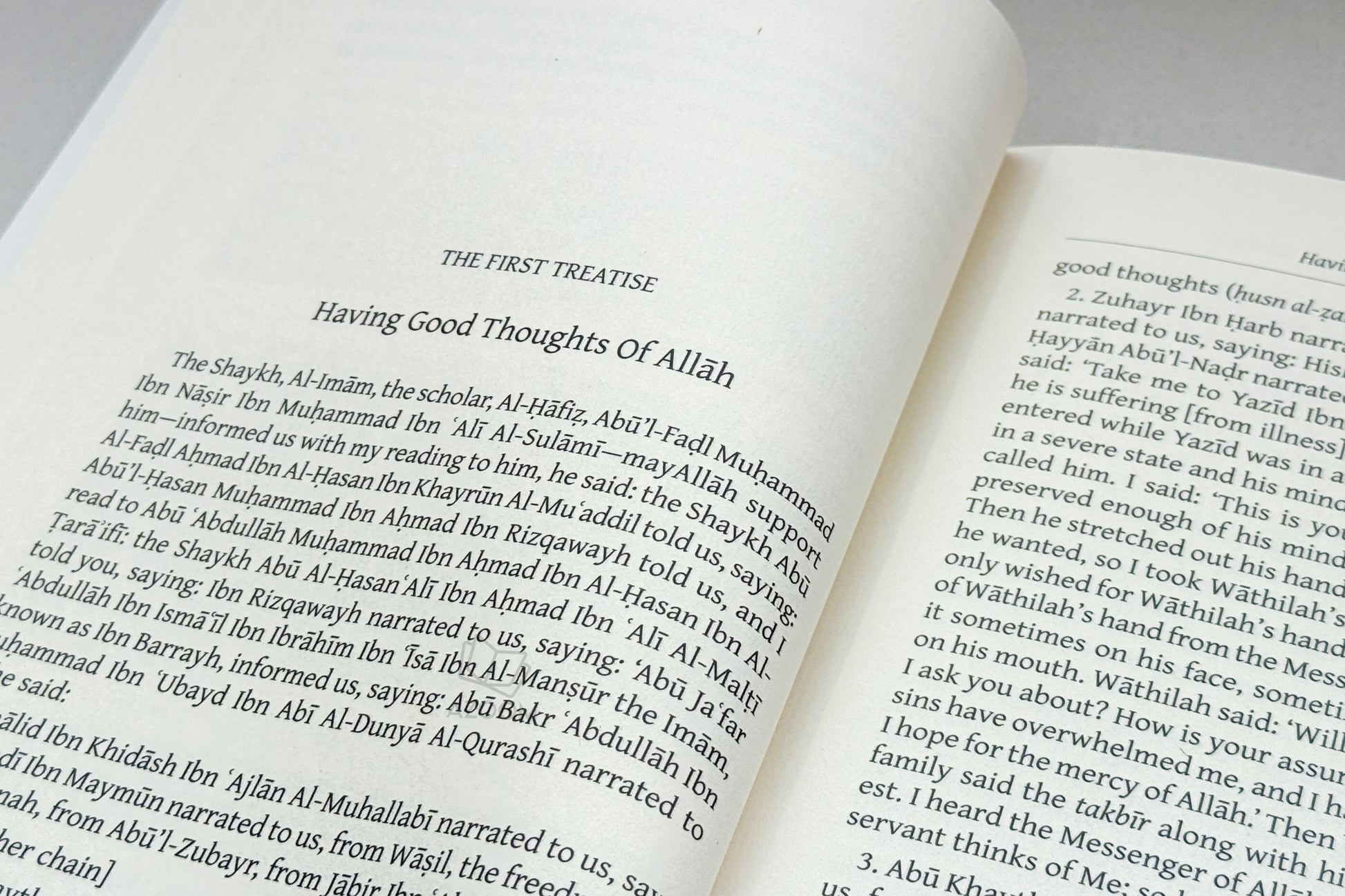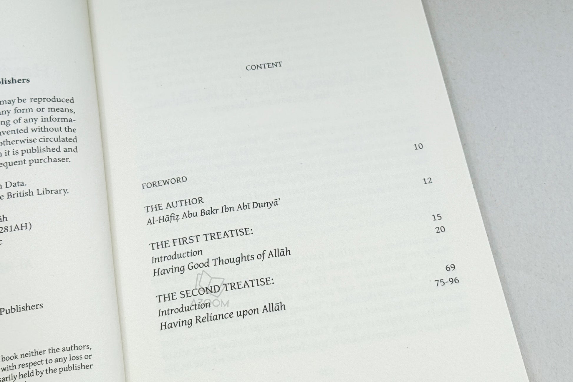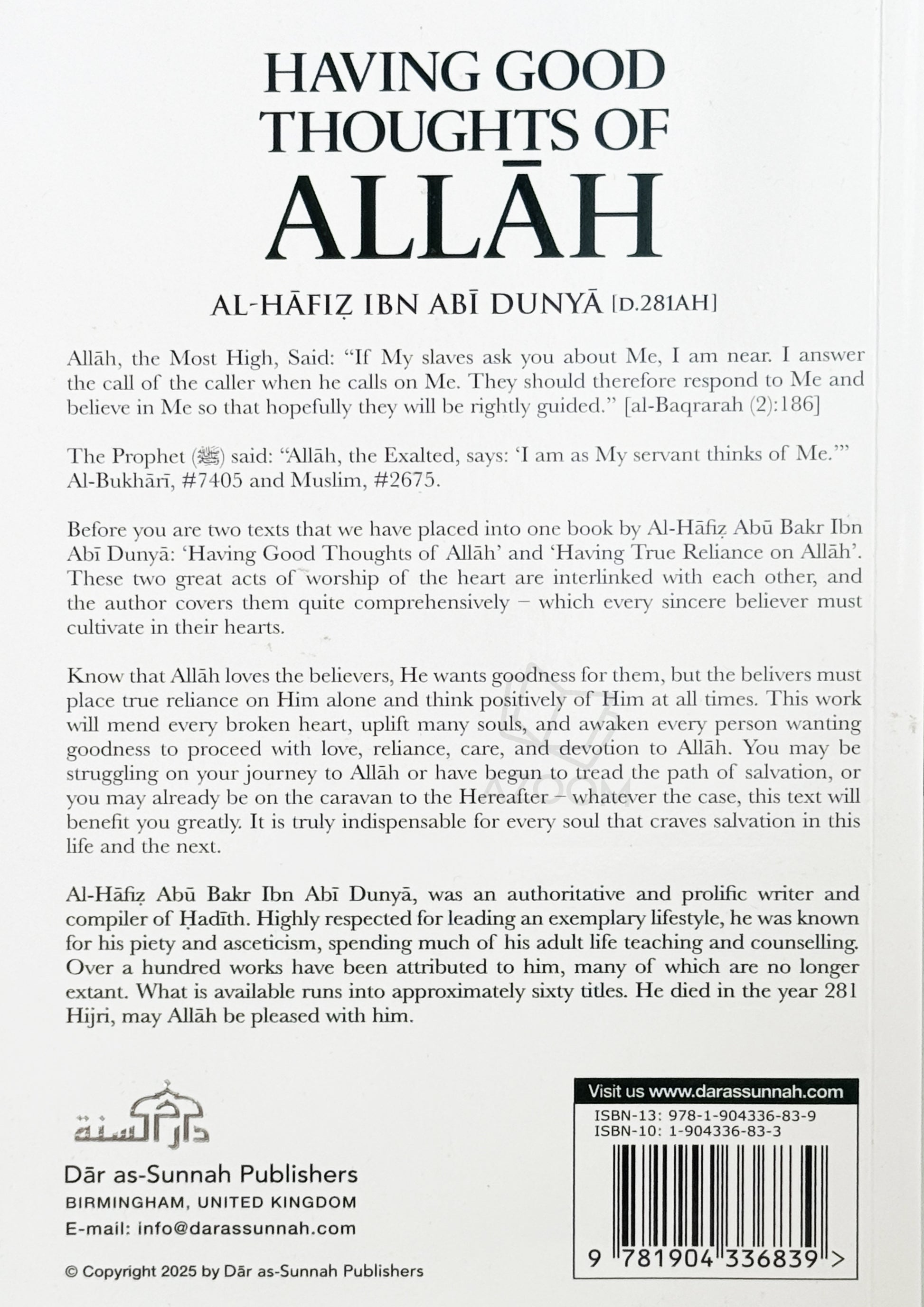 Before you are two texts that we have placed into one book by Al-Hāfiẓ Abū Bakr Ibn Abī Dunyā : ‘Having Good Thoughts of Allāh’ and ‘Having True Reliance on Allāh’. These two great acts of worship of the heart are interlinked with each other, and the author covers them quite comprehensively – which every sincere believer must cultivate in their hearts.