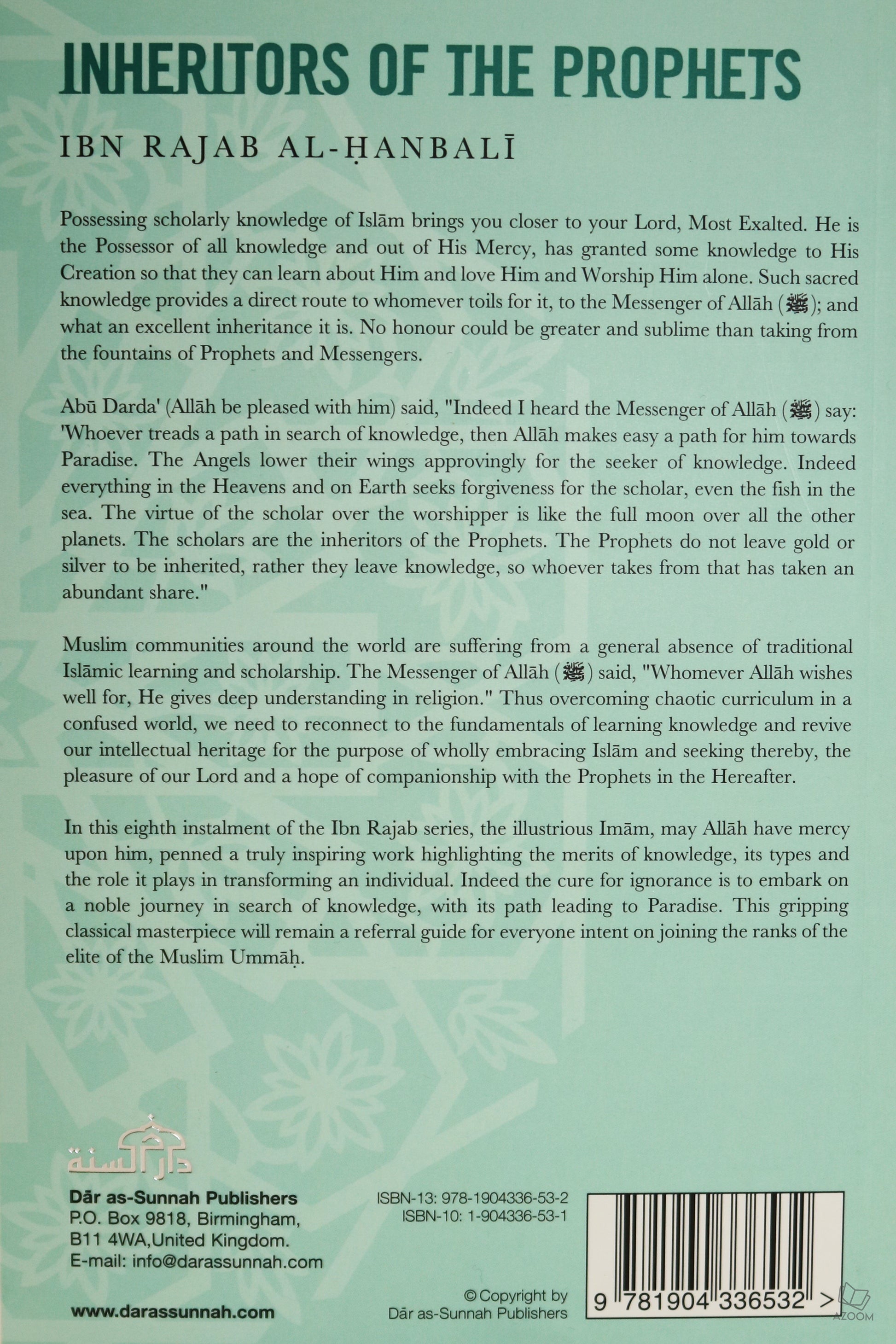 The angels lower their wings approvingly for the seeker of knowledge. Indeed, everything in the Heavens and on Earth seeks forgiveness for the scholar, even the fish in the sea. The virtue of the scholar over the worshipper is like the full moon over all the other planets. The scholars are the inheritors of the Prophets. The Prophets do not leave gold or silver to be inherited, rather they leave knowledge, so whoever takes from that has taken an abundant share." Muslim communities around the world are suffering from a general absence of traditional Islamic learning and scholarship. The Messenger of Allah (peace and blessings be upon him) said, "Whomever Allah wishes well for, He gives deep understanding in religion." Thus overcoming chaotic curriculum in a confused world, we need to reconnect to the fundamentals of learning knowledge and revive our intellectual heritage for the purpose of wholly embracing Islam and seeking thereby, the pleasure of our lord and a hope of companionship with the Prophets in the Hereafter. In this eighth instalment of the Ibn Rajab series, the illustrious Imam, may Allah have mercy upon him, penned a truly inspiring work highlighting the merits of knowledge, its types and the role it plays in transforming an individual. Indeed, the cure for ignorance is to embark on a noble journey in search of knowledge, with its path leading to Paradise. This gripping classical masterpiece will remain a referral guide for everyone intent on joining the ranks of the elite of the Muslim Ummah.