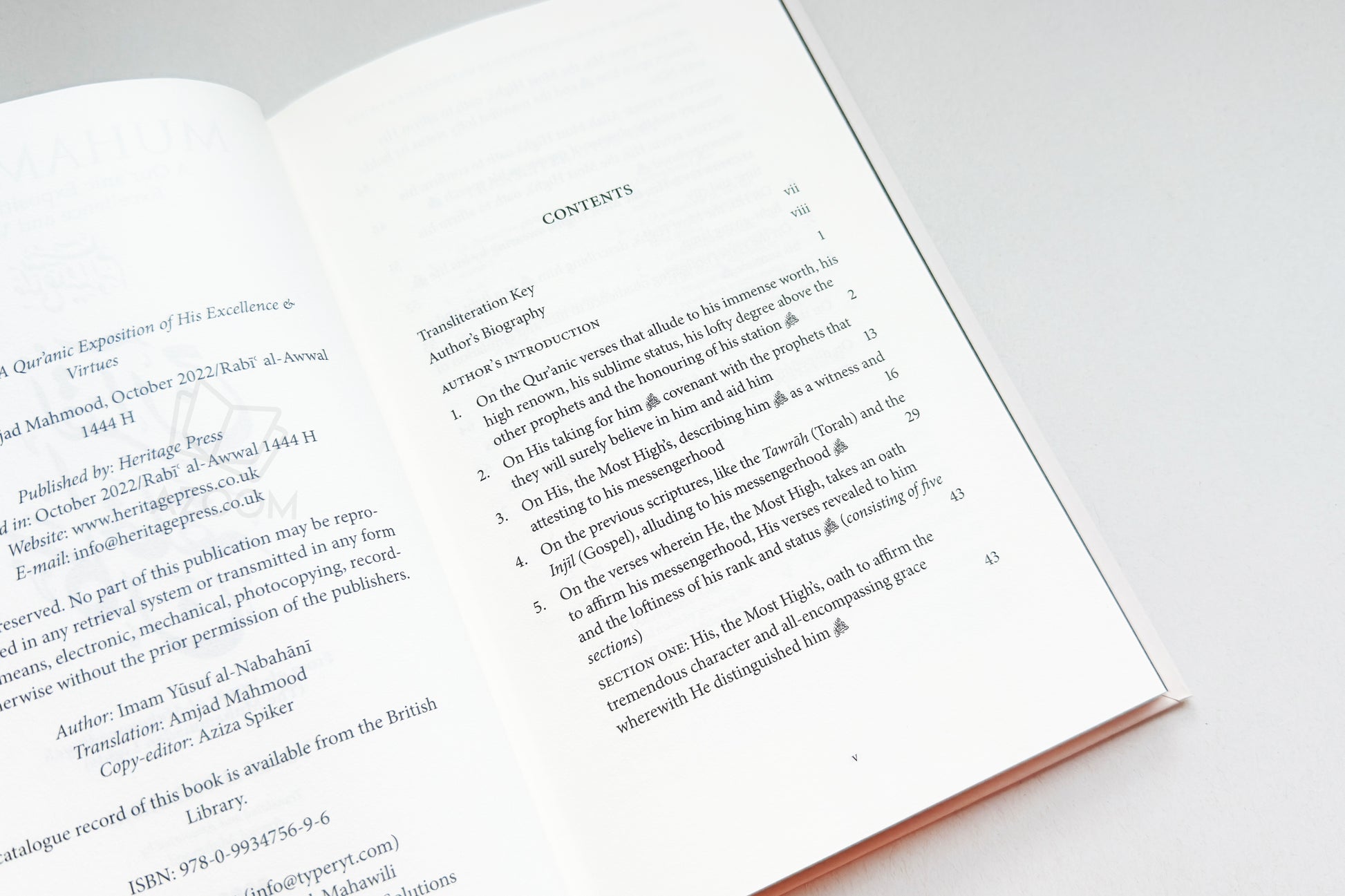 The present work is a translation of one of several sections of Imam Yūsuf al-Nabahānī’s acclaimed work on the Prophet’s biography, characteristics and virtues (Allah bless him and give him peace), al-Anwār al-Muḥammadiyyah (The Muhammadan Lights). The author dedicated this section to an exhaustive treatment of the Qur’anic verses that specifically relate to the Prophet Muhammad (Allah bless him and give him peace): his exalted rank and special status, as well as those verses comprising an exhortation to obey him and emulate his sunnah and the proper manners towards him, and dispelling obscurities arising from otherwise ambiguous verses revealed concerning him (Allah bless him and give him peace), amongst other such matters.