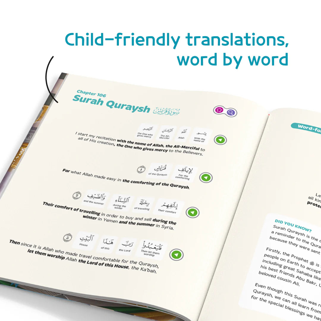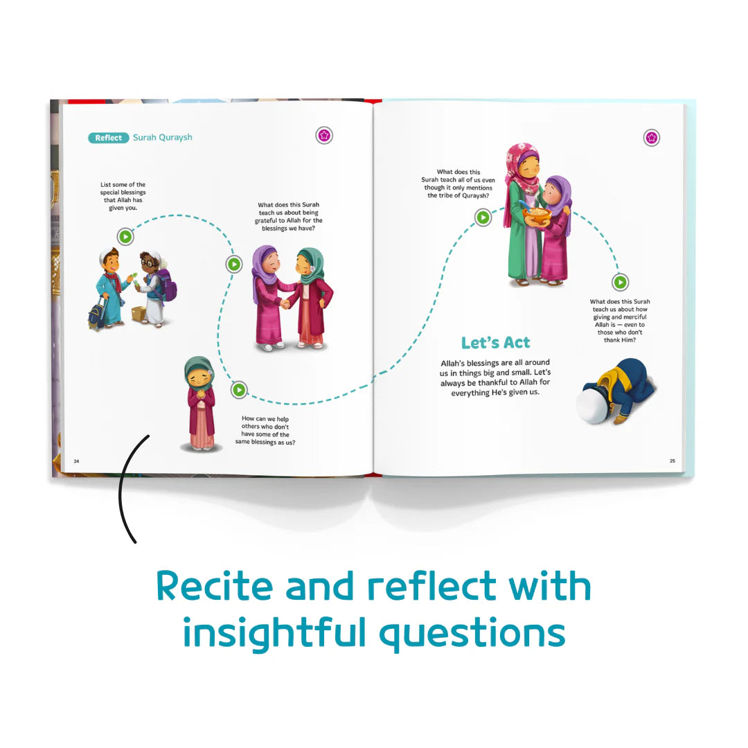 Contains, Surah stories, word by word breakdown of verses and reflection questions.