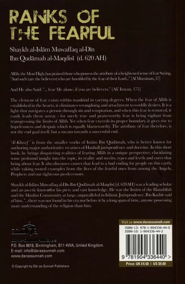 'Al-Khawf ' is from the smaller works of Imam Ibn Qudamah, who is better known for authoring major authoritative treatises of Hanbali jurisprudence and doctrine. In this short book, he brings disquieting realities of fearing Allah in a unique perspective; elucidating some profound insight into the topic, its reality and merits, types and levels and cures that bring about fear. It also discusses causes that lead to a bad ending for people on this earth, while taking rooted examples from the lives of the fearful ones from among the Angels, Prophets and our righteous predecessors.
