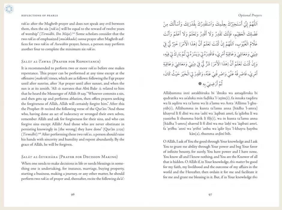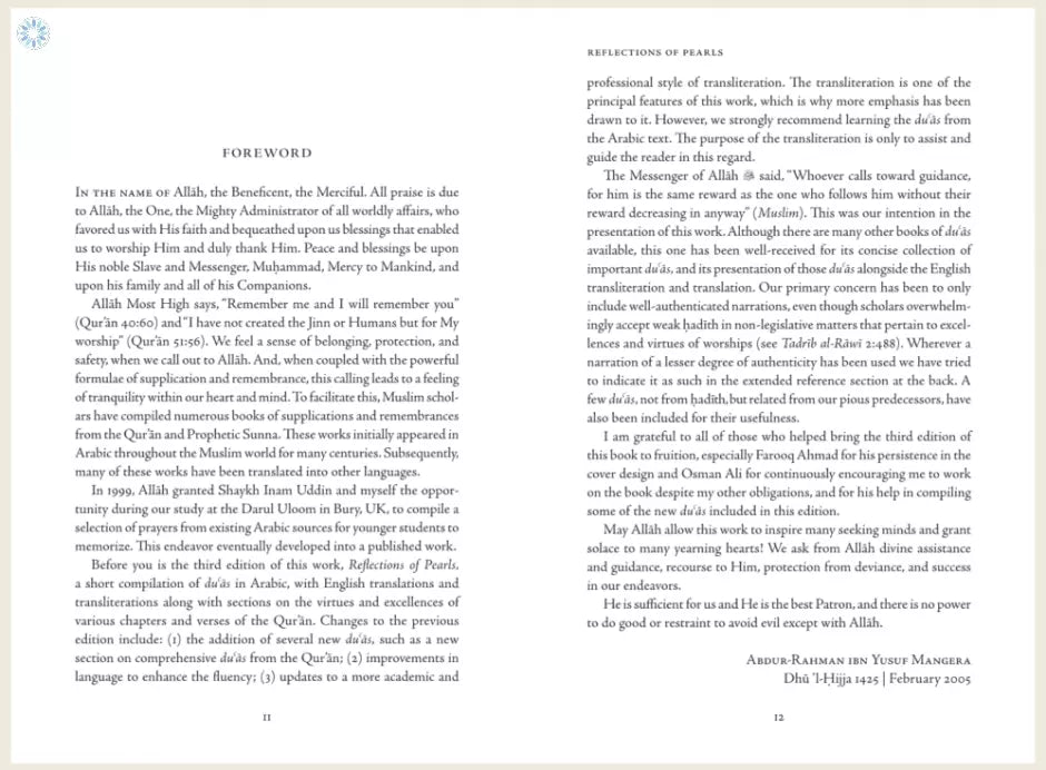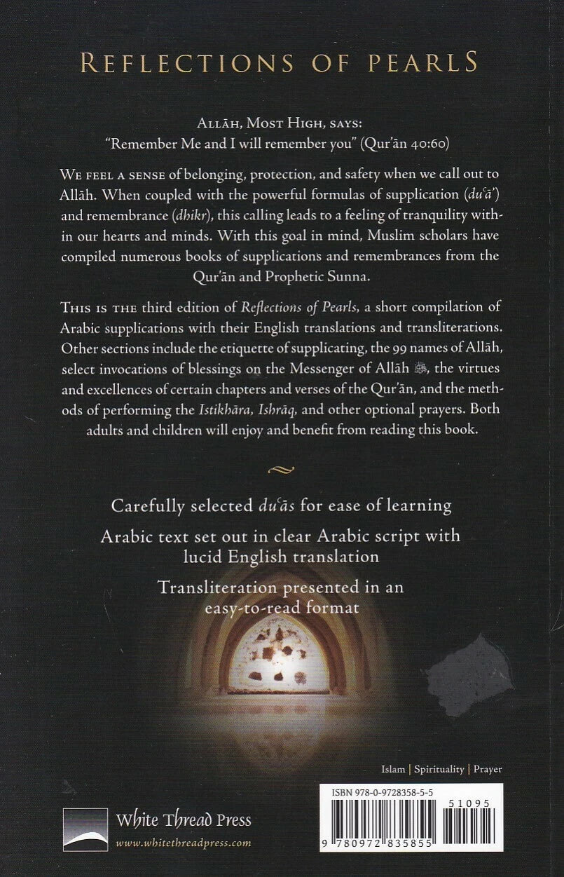 This is the third edition of Reflections of Pearls, a short compilation of Arabic supplications with their English translations and transliterations. Other sections include the etiquettes of supplicating, the 99 names of Allah, select blessings on the Messenger of Allah (may Allah bless him), the virtues and excellences of certain chapters and verses of the Holy Qur’an, and the method of performing the Istikhara, Ishraq, and other optional prayers. Both adults and children will enjoy and benefit from reading this book.
