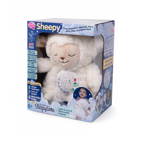 Plays sleepytime nasheeds, dua’s, white noise, & projects stars! Soft & cuddly, Sheepy soothes your baby to sleep by creating a calm environment.
