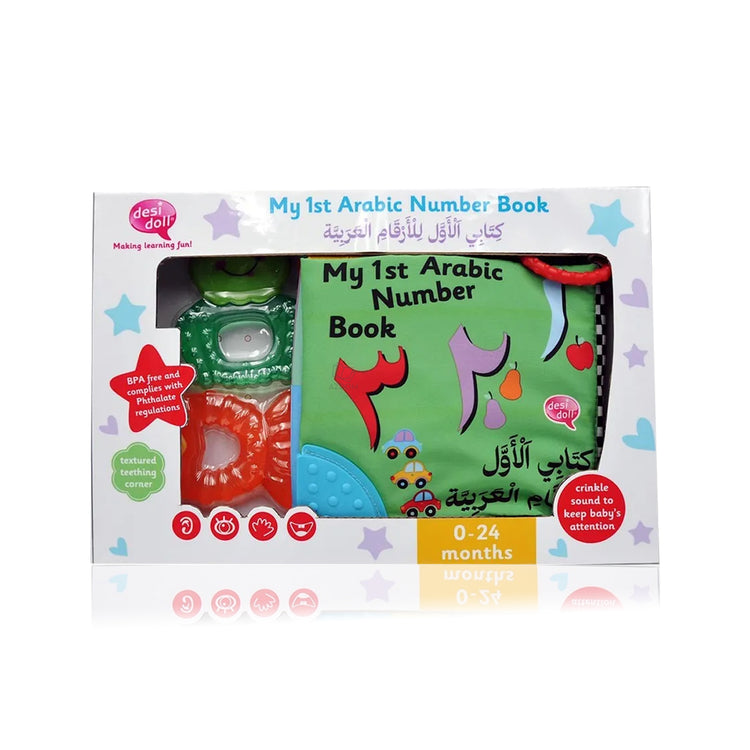 This Arabic numbers book for babies is a soft book for baby ages 0-24 months, designed to introduce Arabic numbers to little Muslims!