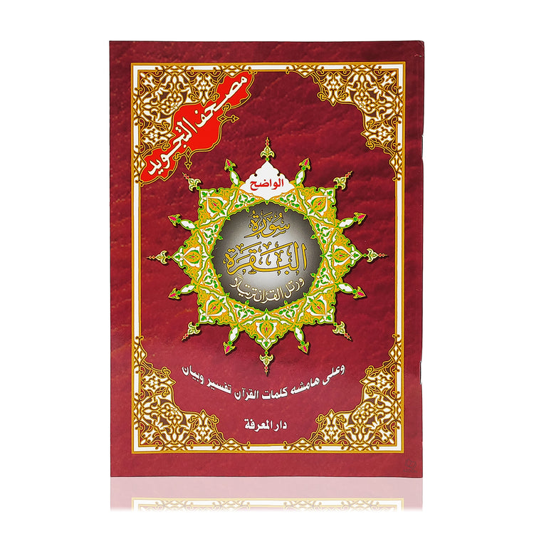 This is Surah Al Baqrah of the Tajweed Quran, which starts from sura "Al Luqman" till sura " Al Baqrah This AlBaqrah comes in the standard portrait form, with a nice glossy soft cover. Each page contains 15 lines as any standard Quran, with an interpretation of selected words placed on the margins on every page.