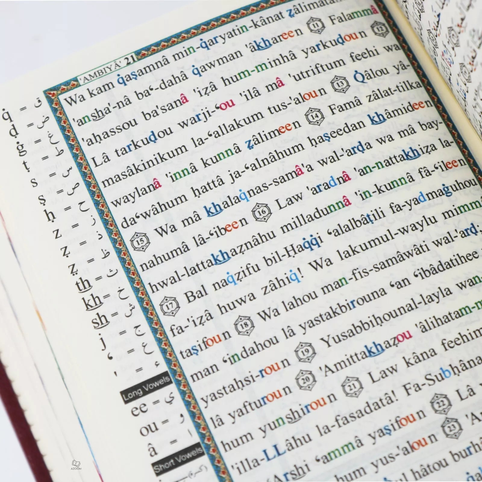 The blessed Qur’an with color-coding in reference to the rules of tajwid. In ‘Uthmani script. Includes explanations and clarification of difficult words (in Arabic). Also, includes an index (in Arabic). 15 Lines.