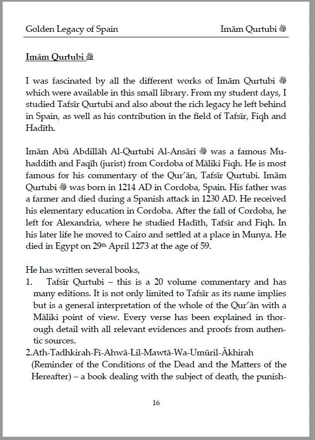 Andalus (modern-day Spain), the long lost history, was once a country that produced many great calibre of Muslim scholars comprising of Mufassirūn, Muhaddithūn, Fuqahā, judges, scientists, philosophers, surgeons, to name but a few. The Muslims conquered Andalus in 711 AD and ruled over it for eight-hundred years. This was known as the era of Muslim glory. Many non-Muslim Europeans during that time travelled to Spain to study under Muslim scholars.
