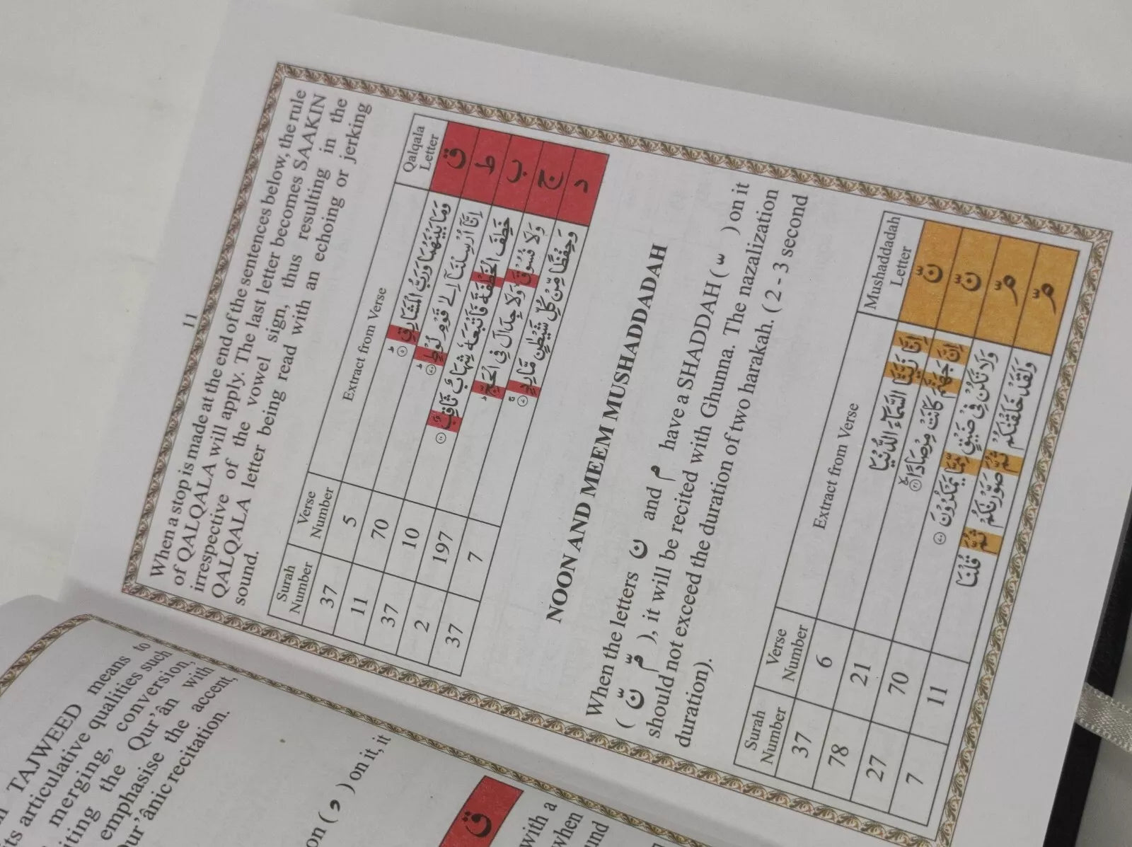 Seven different-color shades have been used: each color representing a different tajwid rule. The actual rules of tajwid in English are included in the back of the edition. This edition of the Qur'an can help those who desire to recite the Qur'an correctly with the proper pronunciations and intonations.