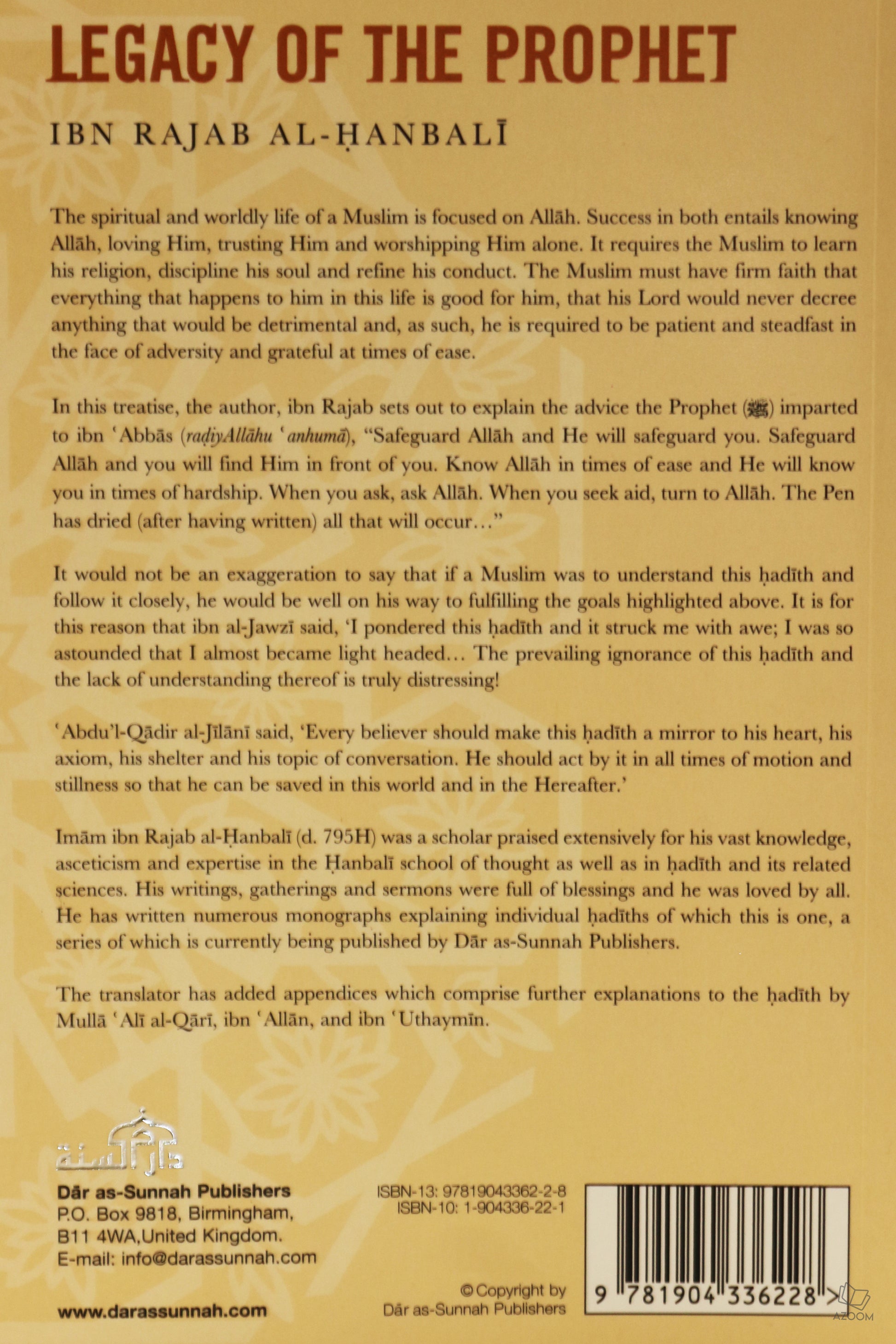 The spiritual and worldly life of a Muslim is focused on Allah. Success in both entails knowing Allah, Loving Him, trusting Him and worshipping Him alone. It requires the Muslim to learn his religion, discipline his soul and refine his conduct. The Muslim must have firm faith that everything that happens to him in this life is good for him, that his Lord would never decree anything that would be detrimental and, as such, he is required to be patient and steadfast in the face of adversity and grateful at times of ease. In this treatise, the author, ibn Rajab sets out o explain the advice the Prophet (s.a.w) imparted to ibn 'Abbas (radiyAllahu 'anhuma), ''Safeguard Allah and He Will safeguard you. Safeguard Allah and you will find Him in front of you. Know Allah in times of ease and He will know you in times of hardship. When you ask, ask Allah. When you seek aid, turn to Allah. The Pen has dried (after having written) all that will occur.